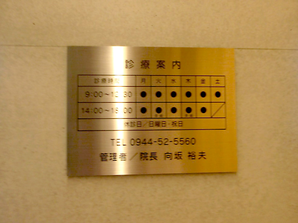 METAL NAMEPLATE SIGN 金属銘板サイン 会社や施設の入口壁面等につけます。ステンレス、真ちゅう等で製作し、耐久性・高級感があります。 。 [スライドショーを見る>>] 響クリニック様 ごはん屋 しんSキッチン様 AROMA SPA LULU様 広石眼科様 広石眼科様 建設業の許可票プレート 鉄板焼 糸様 広石眼科様 向坂眼科様 うえだクリニック小児科様 (株)柿木コーポレーション001 (株)柿木コーポレーション002 ウイズホーム(株)北九州店様 ウイズホーム福岡古賀本店様001 ウイズホーム福岡古賀本店様002 弊社建設業の許可取得しました はらだDental Care Clinic様 みのる内科クリニック様 AYUMI SKIN CLINIC様 はらだDental Care Clinic様 善導寺耳鼻咽喉科様 浦野眼科医院 浦野のりこ整形外科医院様 長崎明治牛乳輸送(株) 福岡営業所様 よしの胃腸内科クリニック様 長崎明治牛乳輸送(株) 福岡営業所様 長崎明治牛乳輸送(株) 福岡営業所様 星の丘リビング けやき様 星の丘リビング なの花様 星の丘ナーシング さくら様 1 2 ... 4 ►